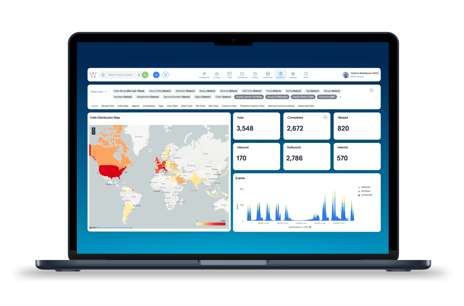 La suite Analytics di Wildix fornisce strumenti di monitoraggio e reportistica per analizzare volumi, durate e costi delle chiamate. Tutti i dati del sistema di comunicazione, accessibili da un'unica interfaccia in Cloud.