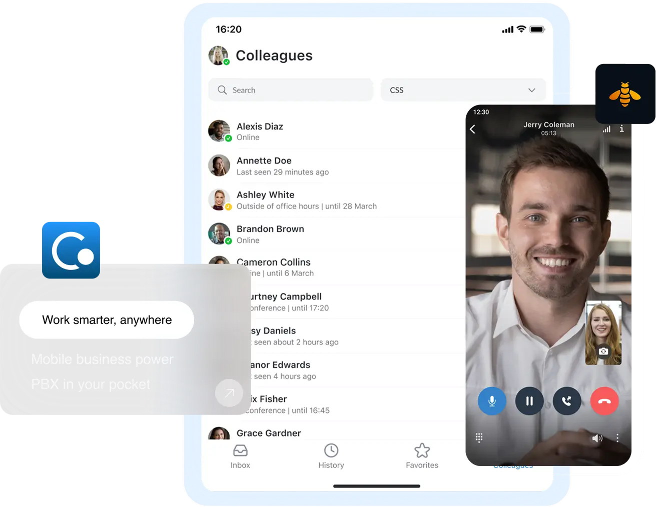 Stesso numero aziendale, stesse funzionalità, ovunque. Trasferisci chiamate, consulta la rubrica, accedi alla cronologia completa: puoi lavorare come se fossi in ufficio.
