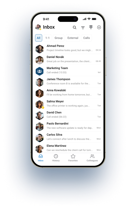 Chiamate, videochiamate, chat, condivisione file: tutto ciò che il tuo team utilizza in ufficio, disponibile su qualsiasi dispositivo mobile.